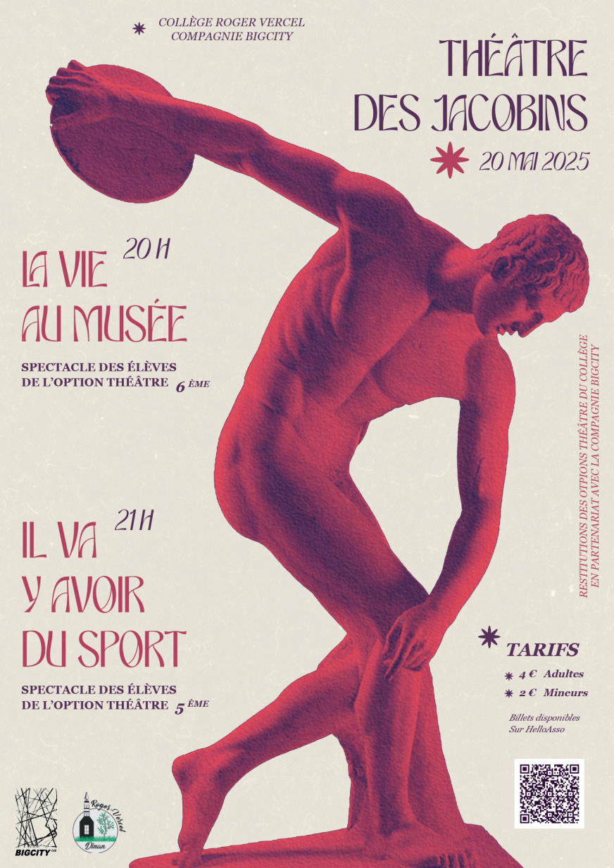 Le collège Roger-Vercel et la Compagnie Big City sont heureux de vous inviter à partager une « Grande » soirée théâtre autour des arts et sport, avec les élèves de 6e et de 5e de l’option théâtre du collège.