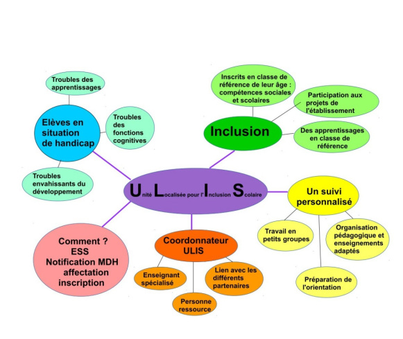 L’ULIS est un dispositif collectif de scolarisation en milieu ordinaire qui met en oeuvre le Projet Personnalisé de Scolarisation (PPS) des élèves en situation de handicap sur décision de la Commission des Droits et de l’Autonomie des Personnes Handicapées après affectation par les services de l’Education nationale.